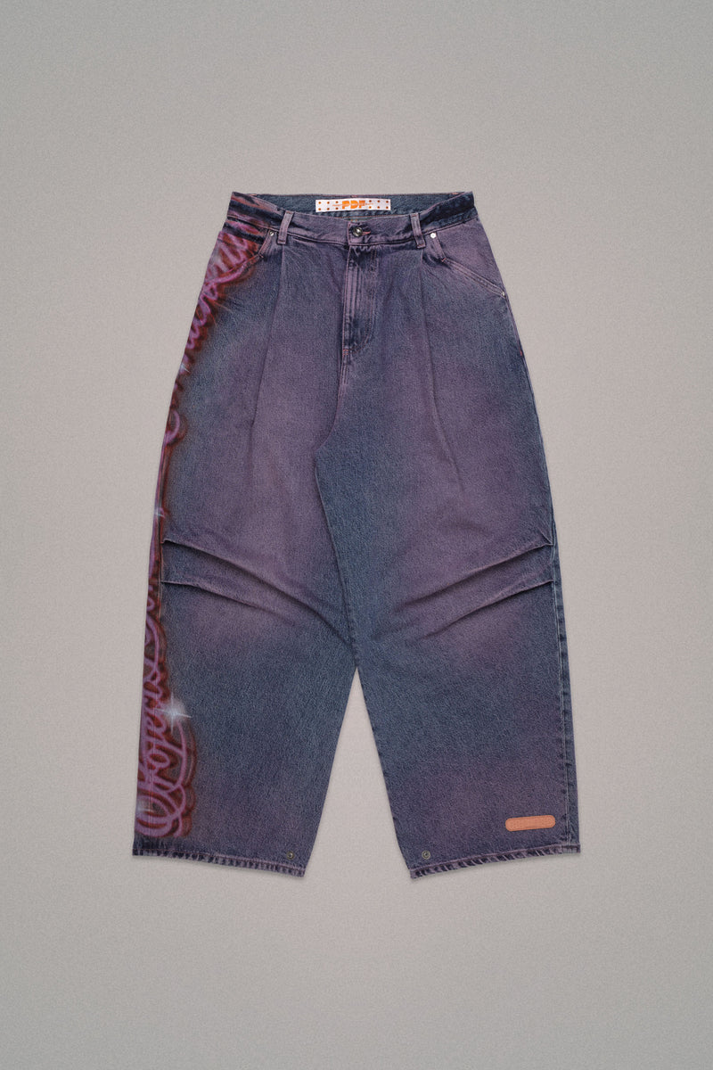 - Black denim with pink spray treatment